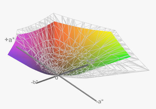 You can see that my Dell screen has a colour gamut that is very similar to sRGB. In some areas the wireframe is a tiny bit bigger than the colour model, but in other areas the colour model is a tiny bit bigger than the wireframe. This is fairly normal for an inexpensive modern screen.
