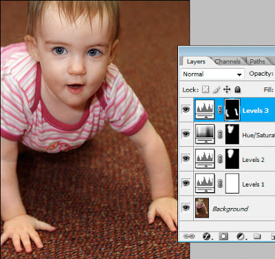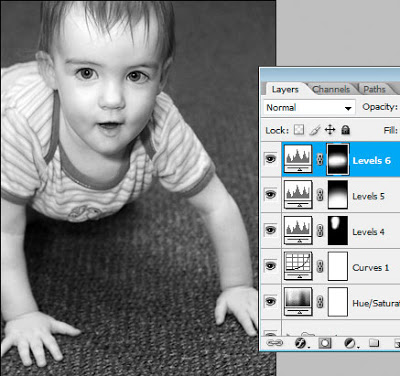 So I hope you can see the advantages to this. As you know, adjustment layers add almost nothing to file size – they are tiny. The only layers that add significant file size are pixel layers – ie my Background layer. If I had saved four different PSD versions of this image – one clean colour, one black-and-white, one grungy and one burned colour – then I would have been saving that big Background layer onto my hard drive four times. This way, I’m only saving it once.