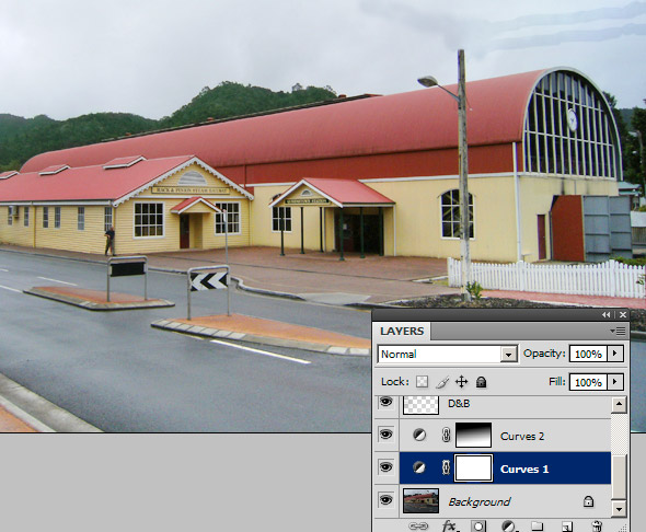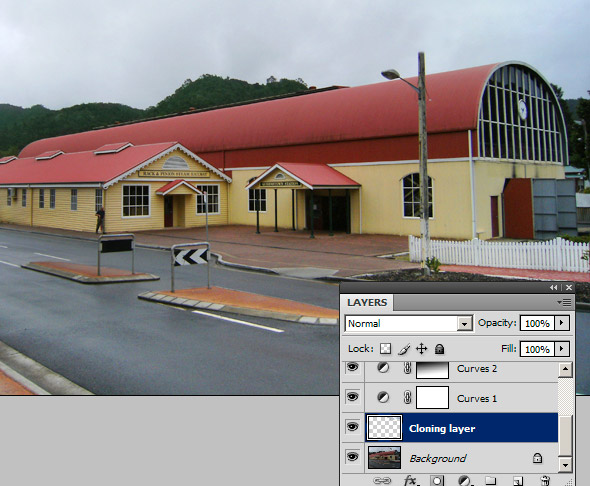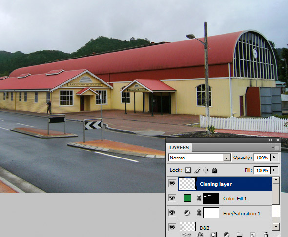I’ve made a new blank layer at the top of the stack, and using the cloning and healing tools, I’ve erased the power lines, and shortened the pole a little. Looks fine, right? Well, not really.