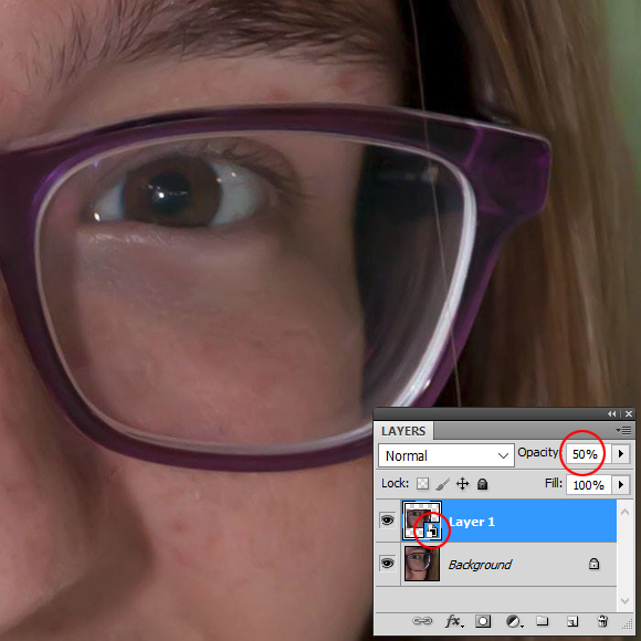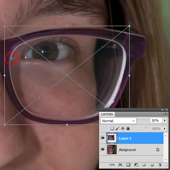 Duplicate the selected area onto its own layer, then immediately go to the Layer menu and convert the new layer to a Smart Object. (Elements users, you can’t do this step. It’s ok, it’s not the end of the world). Then lower the layer opacity by half, ready to enlarge: