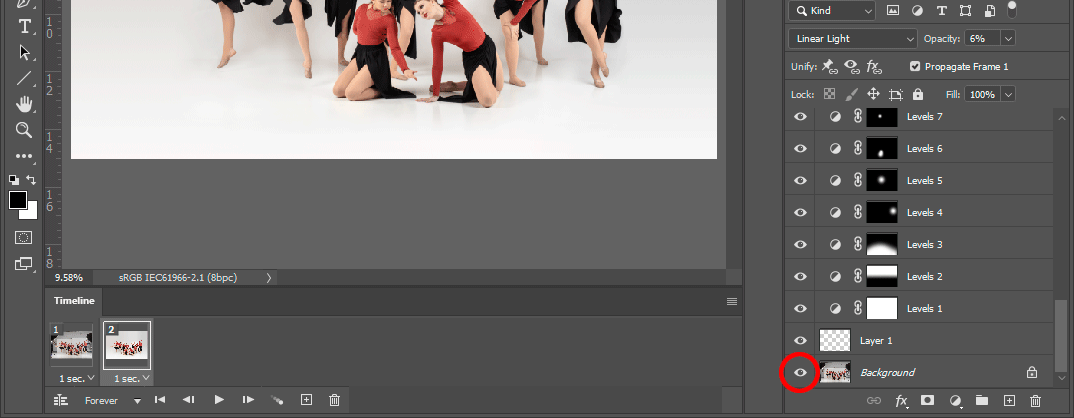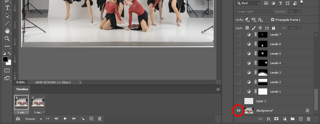Then select the second frame, and Alt-click the eye of the Background layer again, to turn all the layers back on.