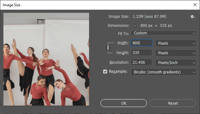 Go to your Image Size dialog and choose an appropriate pixel width. I've chosen 800px for this demonstration.
