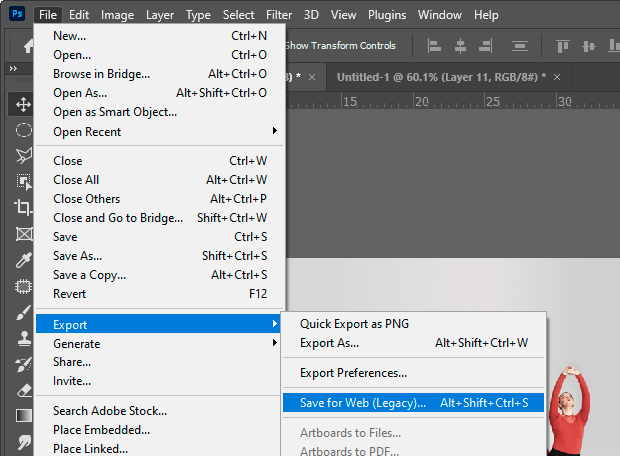 Hit Alt Shift Ctrl S, or go via the File menu as shown, to get the Save for Web window.