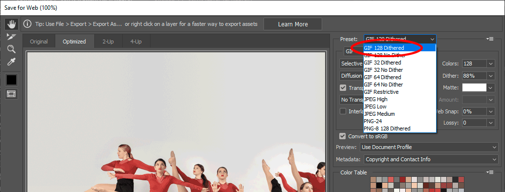 Choose the "GIF 128 Dithered" preset ...
