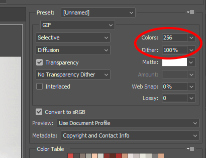 Choosing the maximum amount of colour (256) and the maximum amount of dither (100%) makes for maximum file size, but I really think it's worth it. Everyone understands that gif files aren't high quality, but this way you're making it the best quality it can be in the circumstances.
