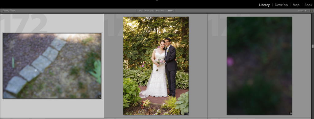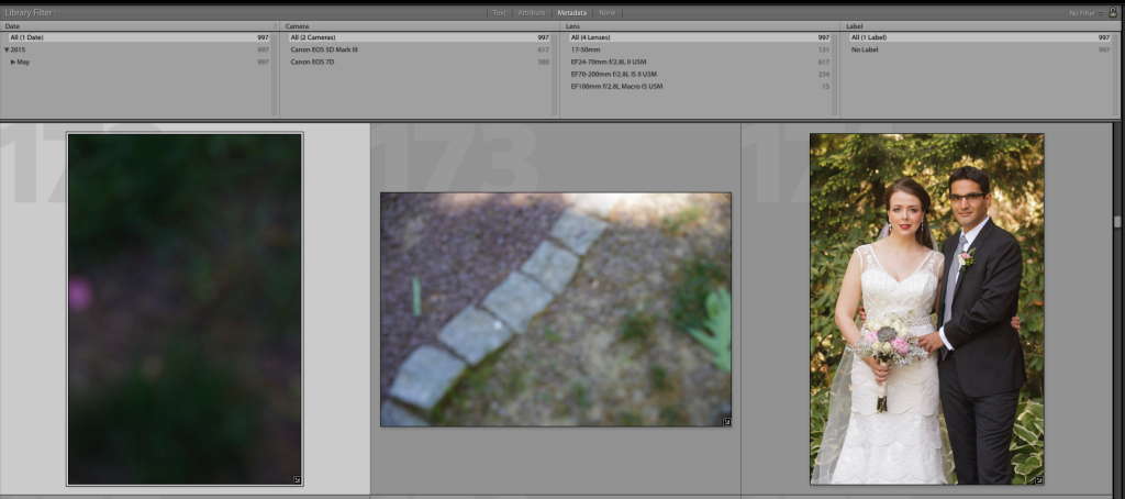 Import all your files into Lightroom. Scroll through them in the Library module until you can identify files taken from each camera at a simultaneous (or near-simultaneous) moment. If you took simultaneous reference photos while shooting, this step will be easy. If not, look for a key moment where you and your second likely took simultaneous shots — the first kiss, the cutting of the cake, etc.
