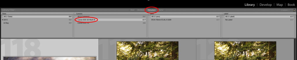 Go back to the filter bar, and this time click on the other camera to show only files taken by that camera. Find and select the reference photo taken by this camera. Then hit ctrl+A (or cmd+A on a Mac) to select all the files taken by this camera. You’ll note that while all the files in your Library are highlighted, the reference photo is highlighted with a stronger white.
