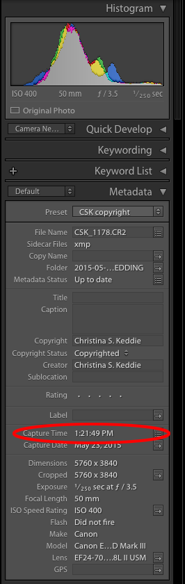 Look at the metadata panel over on the right again, and now click on the box to the right of the Capture Time field (circled in red in the screenshot above). This box will bring up the Edit Capture Time window. Note that your reference photo will be in the preview on the left in this window.