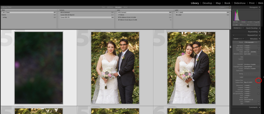 One awesome feature built right into Lightroom is the ability to batch adjust timestamps for all files from a single camera. This feature is a huge timesaver for any weddings or sessions when you’re handling files from multiple cameras — if you’ve got a second photographer, or if you’re shooting with two bodies, for instance. I’m not always able to manually sync all the cameras before an event starts (often, I have my seconds start with the groom while I start with the bride), so knowing that I can very easily batch adjust the timestamps after the fact is a huge plus!