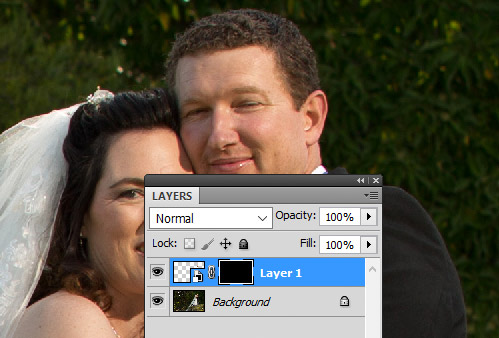 Then hide the layer with a black mask, and paint white to reveal the new head where you want it. Again, I must stress the importance of frequently turning the layer off and on, and very carefully examining your masking. Don’t leave any trace of your work.